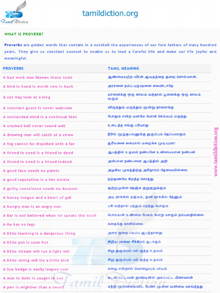 Tamil Proverbs With Their English Translation Proverbs English Translation Translation - * because tamil proverbs are the short form of popular sayings, usually of unknown and an ancient origin.